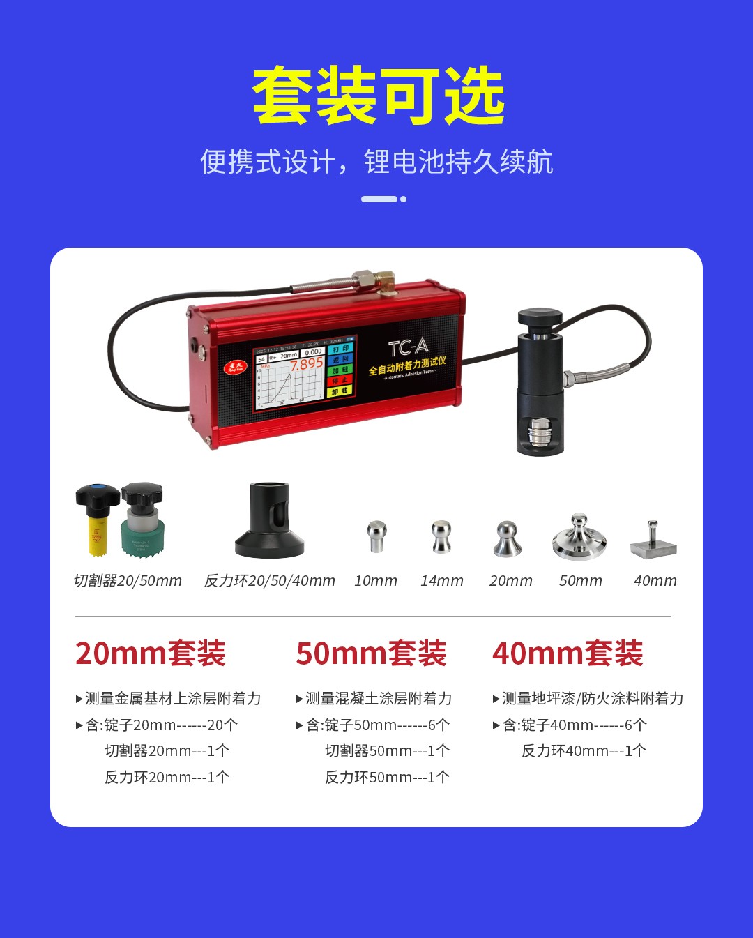 TC-A全自动附着力测试仪,由北京天地星火科技发展有限公司【星火牌】研制、生产,可测量金属、混凝土、木材、塑料等刚性基体表面涂层的附着力。经国家认定机构检测合格。该仪器的工作原理是利用液压系统使被测基体表面一定直径的涂层脱离来测量涂层的附着力,测试仪的多功能触摸液晶显示屏显示附着力的检测过程,以 MPa 或 kN 或 Psi 为单位显示。该产品依据国际及中国相关标准设计制造,技术可靠,性能稳定。